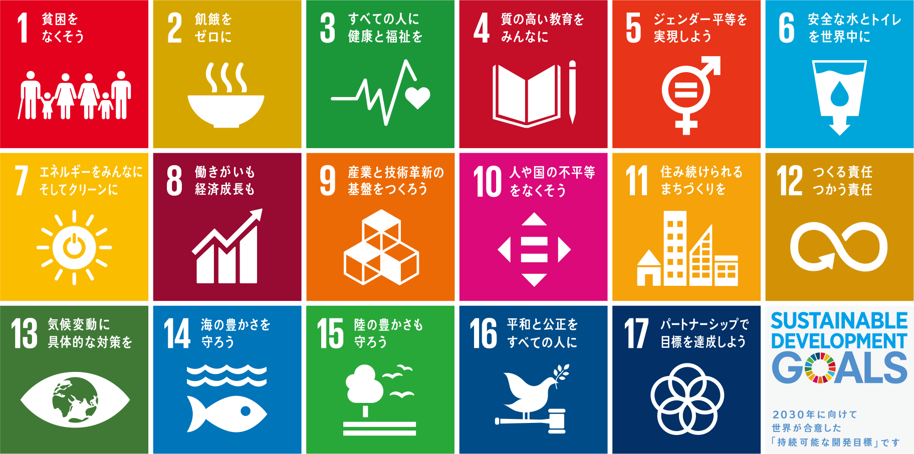 SDG’s(エス・ディー・ジーズと読む)とは、2015年の国連で採択されたもので、国連加盟国193国が、2030年までに「持続可能な世界にしていくために、我々地球人が、具体的に何を目標に生活をしていけば良いのか。」ということを、誰にでもわかりやすく17項目の目標と、それぞれの目標に関しての169項目のターゲットを総称したものです。